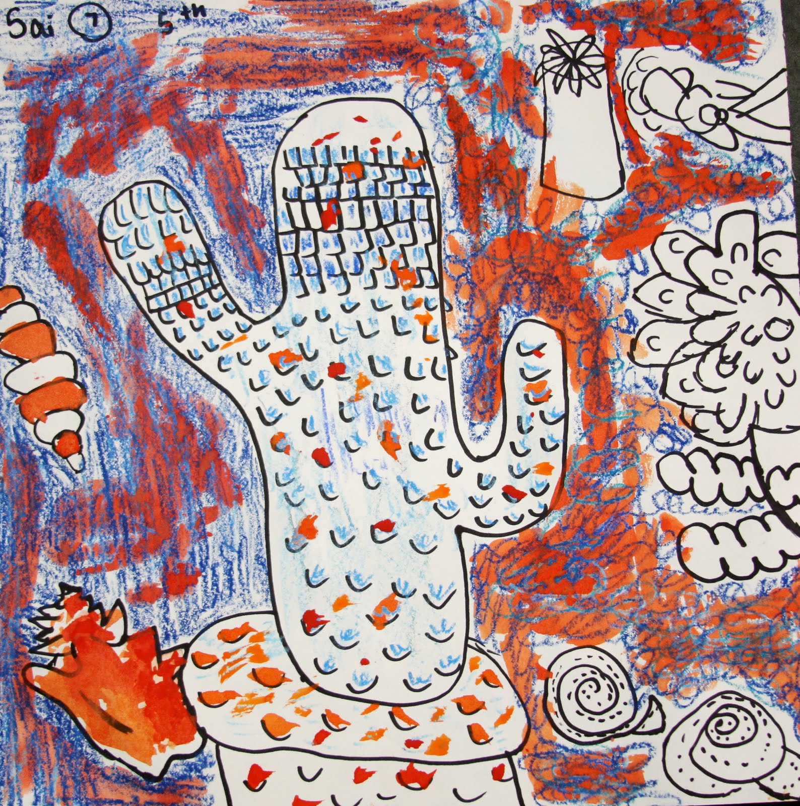 First, students were given an assortment of objects from nature to observe and draw using Sharpie. K-2nd grade were given shells only, while 3rd-5th grade were given shells, cacti, succulents, aloe and airplane plants, gourds and artificial (but realistic) flowers, plus a rather large cactus pinata! With each grade level, we discussed observation drawing and described that drawing process in the following ways: